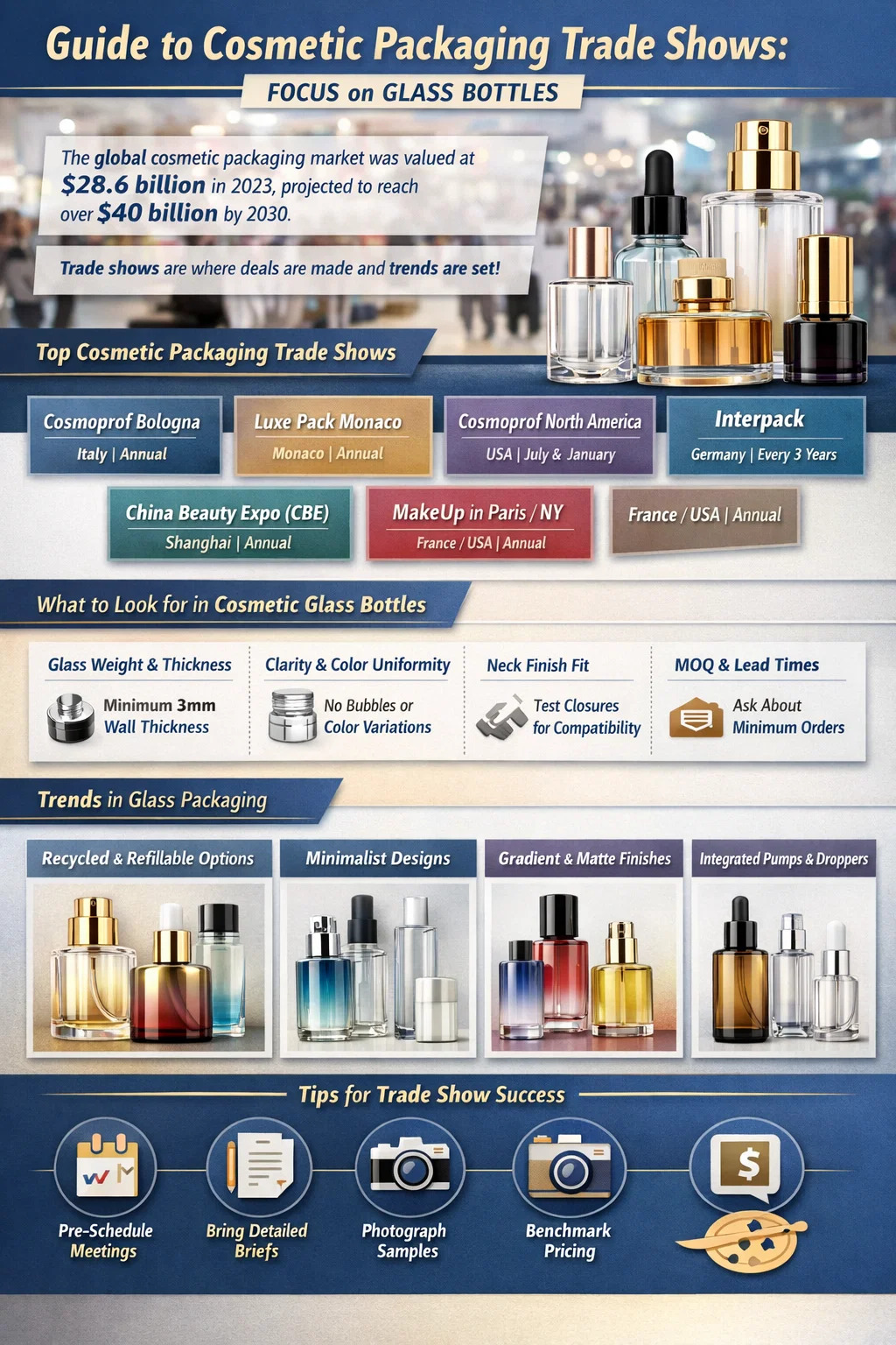 화장품 포장재를 소싱하는 경우, 특히 다음과 같은 고급 소재를 사용합니다. 화장품 유리병 — 올바른 무역 박람회에 참석하는 것은 귀하가 내릴 수 있는 가장 효율적인 결정 중 하나입니다. 단일 장소에서 수백 개의 공급업체를 비교하고, 실제 샘플을 처리하고, 가격을 직접 협상하고, 이메일 지원을 통해 복제하는 데 수개월이 걸리는 관계를 구축할 수 있습니다. 전 세계 화장품 포장 시장의 가치는 대략 2023년에는 286억 달러 Grand View Research에 따르면 2030년까지 400억 달러 이상에 이를 것으로 예상됩니다. 무역 박람회는 이 시장의 상당 부분이 형성되는 곳입니다. 거래가 성사되고 추세가 설정되며 공급업체 네트워크가 구축됩니다.