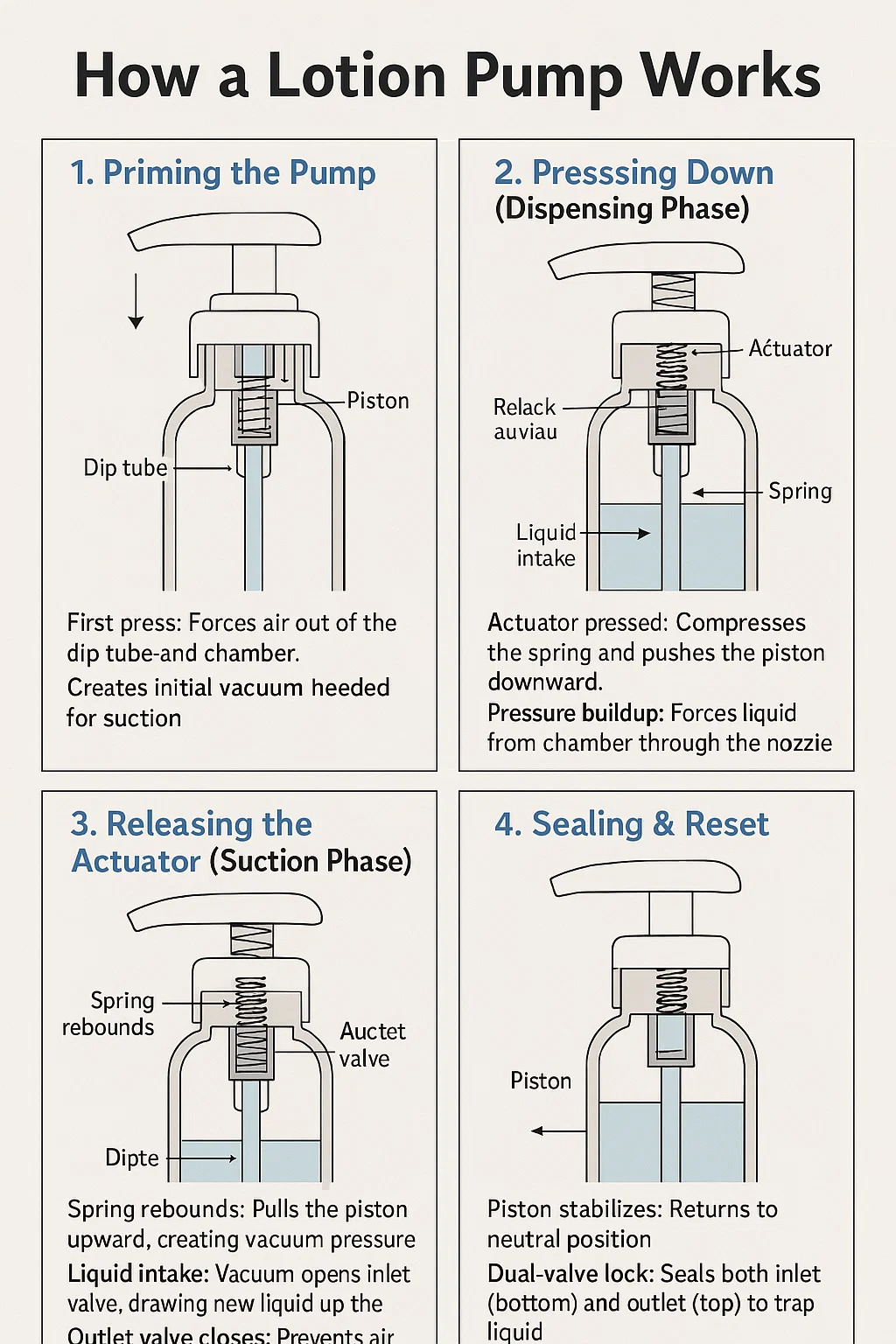 액체 흡입: 진공이 흡입 밸브를 열어 새로운 액체를 딥 튜브 위로 끌어올립니다.