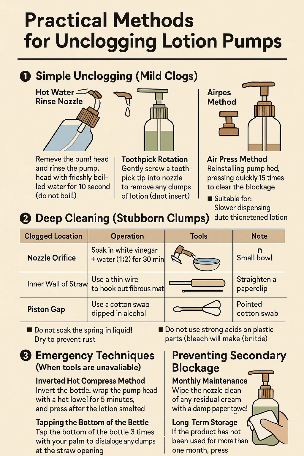뜨거운 물 헹굼 노즐: 펌프 헤드를 제거하고 갓 끓인 물로 노즐을 10초 동안 헹궈(끓이지 마세요!) 건조된 로션을 녹입니다.