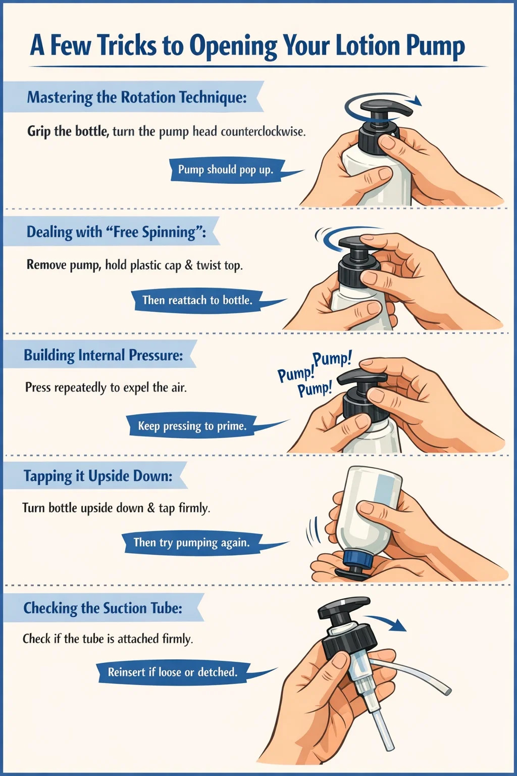 동작: 이 시점에서는 인내심을 갖고 지속적으로 빠르게 눌러야 합니다. 일부 큰 병의 로션이나 특히 두꺼운 크림의 경우 튜브에서 공기를 빼내고 바닥에서 액체를 끌어 올리려면 수십 번 눌러야 할 수도 있습니다.