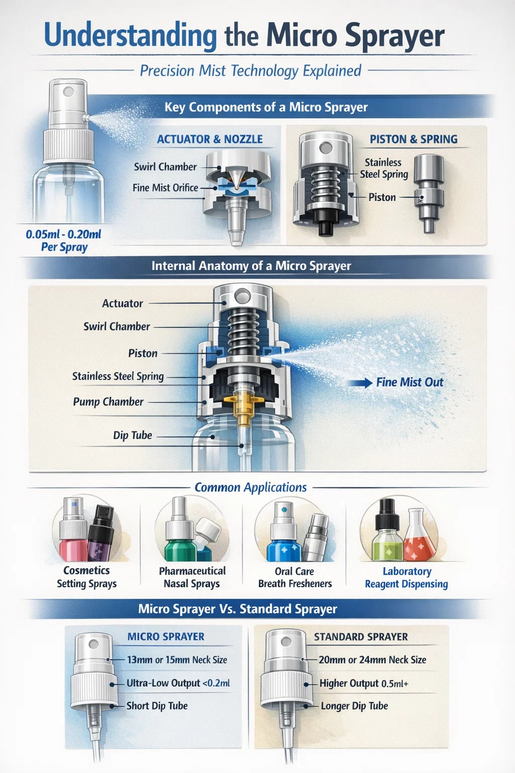 질문에 대답하려면 "마이크로 분무기란 무엇인가요?" , 이는 스트로크당 출력량이 매우 낮은 매우 미세하고 일관된 미스트로 액체를 변환하도록 설계된 정밀 엔지니어링 디스펜싱 장치입니다. 가정용 청소에 사용되는 표준 트리거 분무기와는 달리, 마이크로 분무기 일반적으로 사이에 분배 0.05ml와 0.20ml 한 번에 제품을 한 번에 처리할 수 있으므로 복용량 조절과 섬세한 도포가 가장 중요한 고가치 액체에 이상적인 선택입니다.