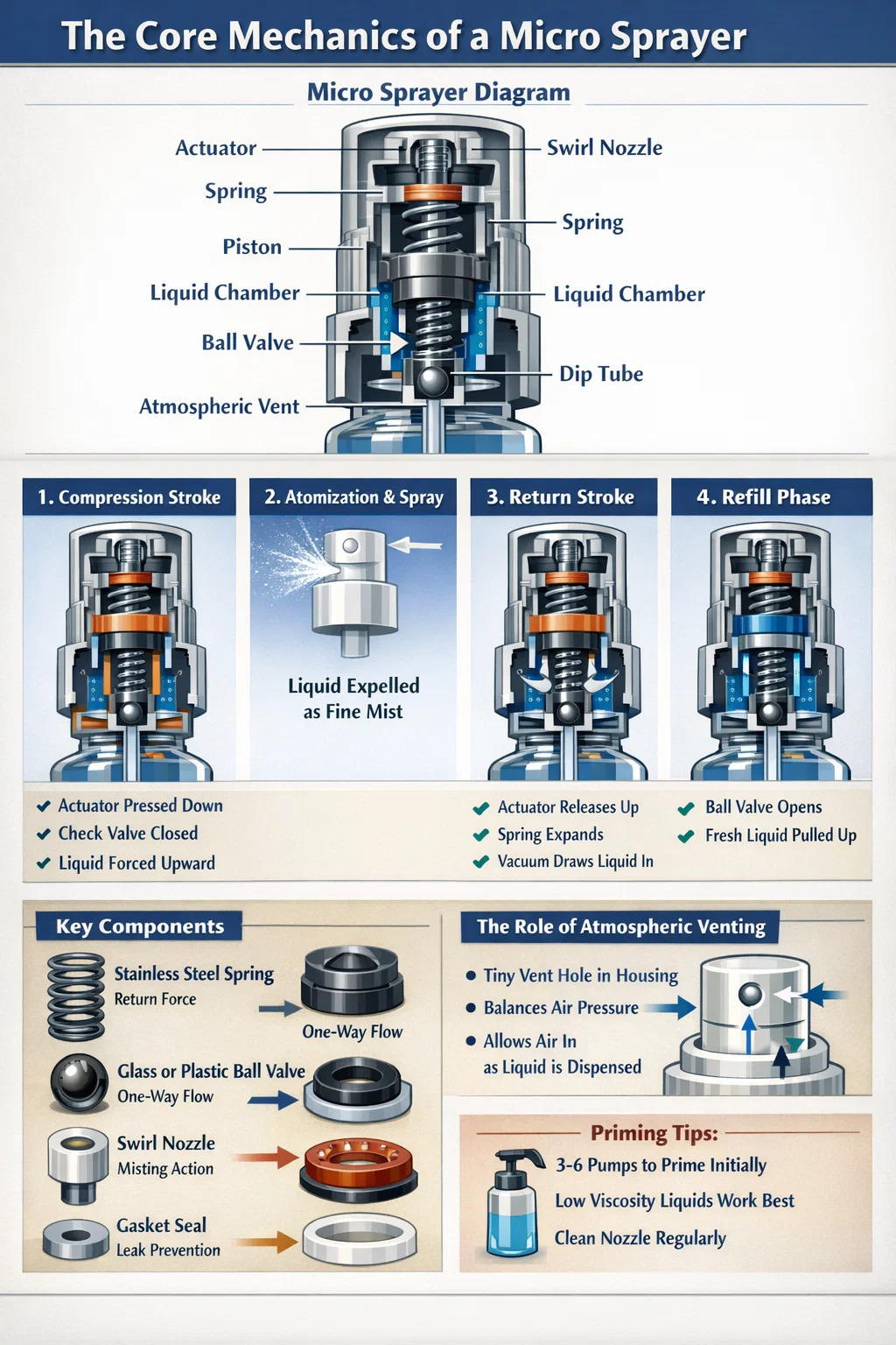 근본적인 마이크로 분무기의 작동 원리 이는 액체와 대기압의 변위를 기반으로 하며, 특히 용적식 펌프 메커니즘 . 액추에이터를 누르면 스프링이 압축되고 작은 챔버 내부의 부피가 줄어들어 액체가 정밀 노즐을 통해 밖으로 배출됩니다. 해제되면 스프링이 피스톤을 뒤로 당겨서 진공 딥 튜브를 통해 병에서 신선한 액체를 끌어와 다음 스프레이를 위해 챔버를 다시 채우는 것입니다.